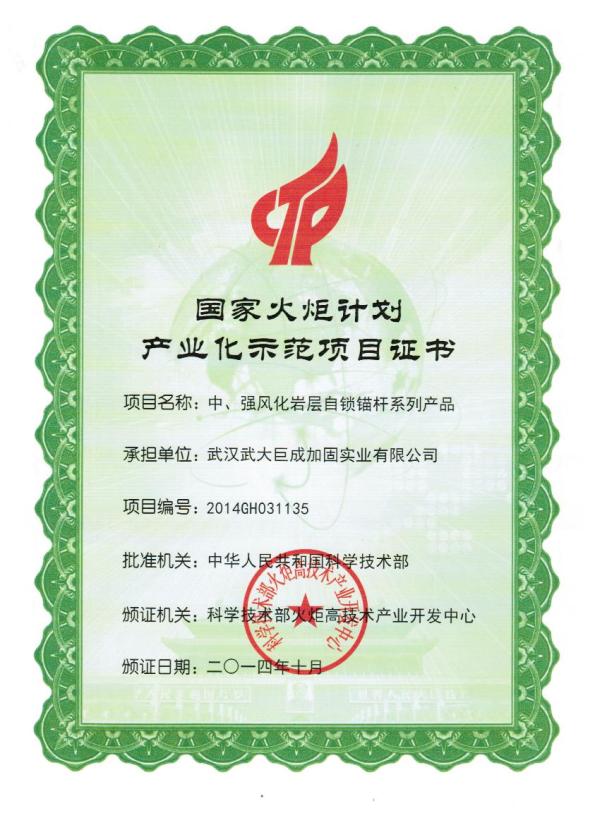 2014年科學(xué)技術(shù)部“國(guó)家火炬計(jì)劃產(chǎn)業(yè)化示范項(xiàng)目證書(shū)”