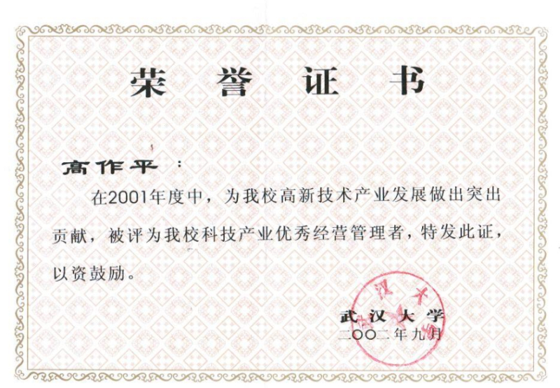 2001年度武漢大學(xué)“科技產(chǎn)業(yè)優(yōu)秀經(jīng)營(yíng)管理者”