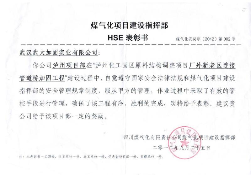2012年四川煤氣化有限責(zé)任公司“HSE表彰書(shū)”