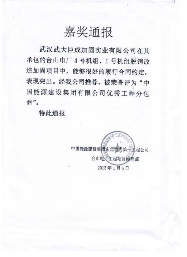 2013年中國(guó)能源建設(shè)集團(tuán)有限公司優(yōu)秀工程分包商