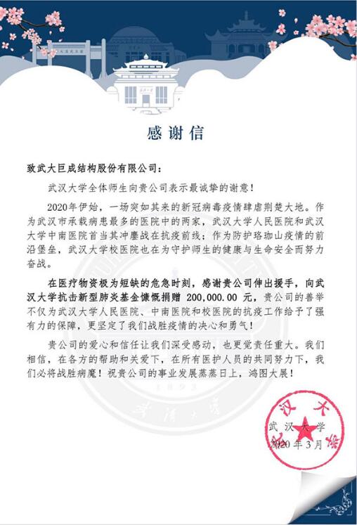 2020年向“武漢大學(xué)抗擊新型冠狀病毒感染肺炎基金”捐款20...