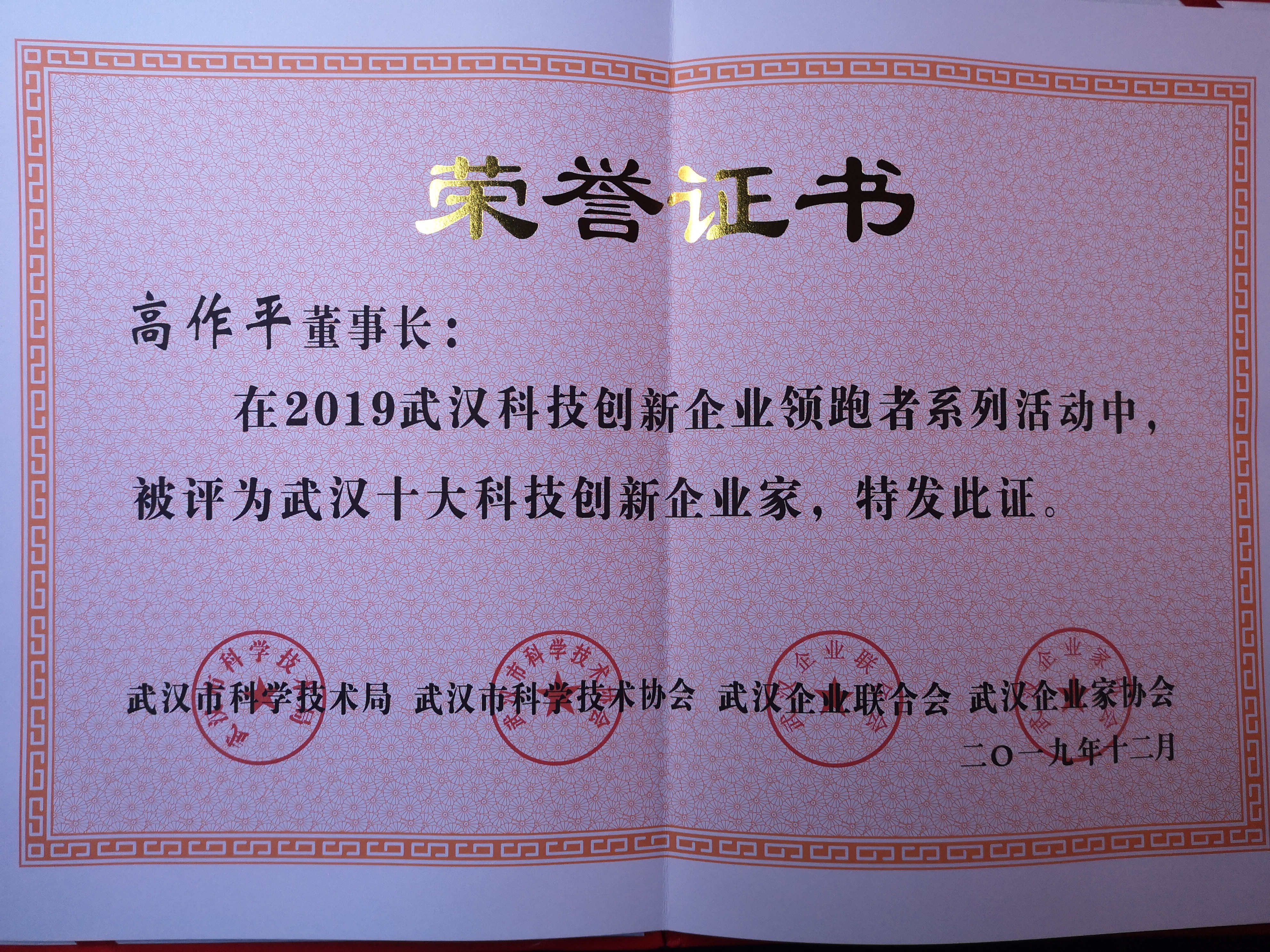 2019武漢十大科技創(chuàng)新企業(yè)家證書(shū)