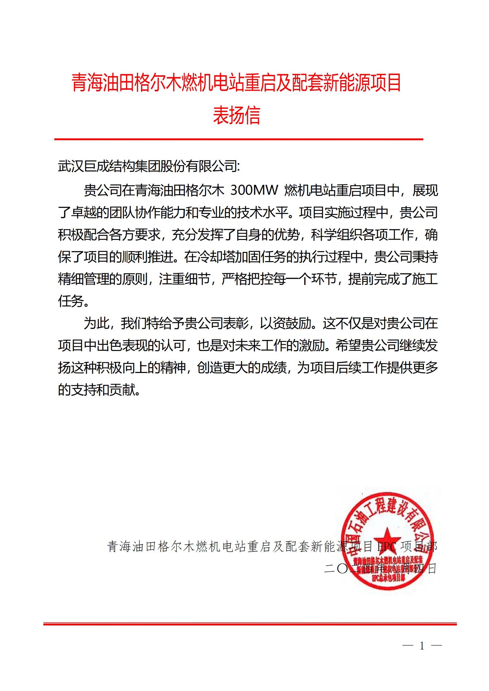 2024年青海油田格爾木冷卻塔加固項(xiàng)目 表?yè)P(yáng)信