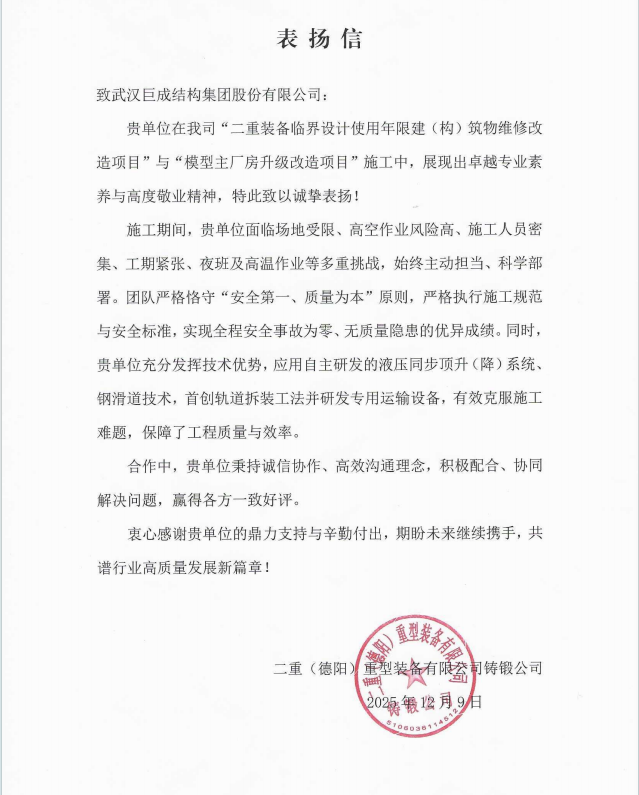 2025年二重(德陽(yáng))重型裝備有限公司 表?yè)P(yáng)信