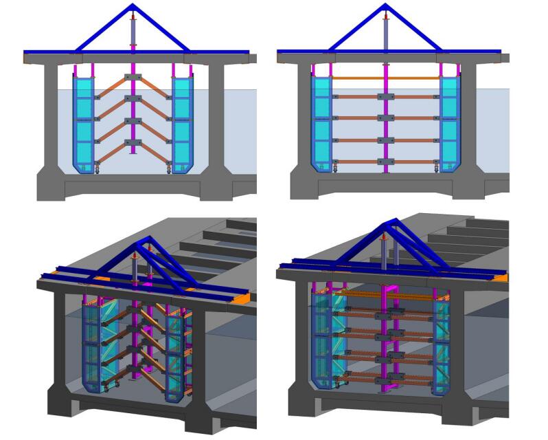 針對(duì)大型渡槽結(jié)構(gòu)不中斷輸水施工,巨成結(jié)構(gòu)研究開(kāi)發(fā)了渡槽施工專(zhuān)用圍堰,通過(guò)可伸縮結(jié)構(gòu)將兩側(cè)隔水箱連接,吊裝入水后張開(kāi)貼緊側(cè)壁,通過(guò)高壓水帶形成密封隔水,再兩側(cè)隔水箱內(nèi)水排干,形成干地作業(yè)環(huán)境,由此通過(guò)中間過(guò)水,兩側(cè)即可進(jìn)行側(cè)壁修復(fù)。對(duì)于止水帶修復(fù)的情況,可先更換兩側(cè)隔水箱區(qū)域止水帶,再結(jié)合隔水膜將中間區(qū)域隔水,兩側(cè)過(guò)水,將中間區(qū)域形成干地作業(yè)環(huán)境。通過(guò)底部行走輪和側(cè)面限位輪,可通過(guò)牽引系統(tǒng)將隔水裝置在水下進(jìn)行牽引行走,可做到連續(xù)施工。