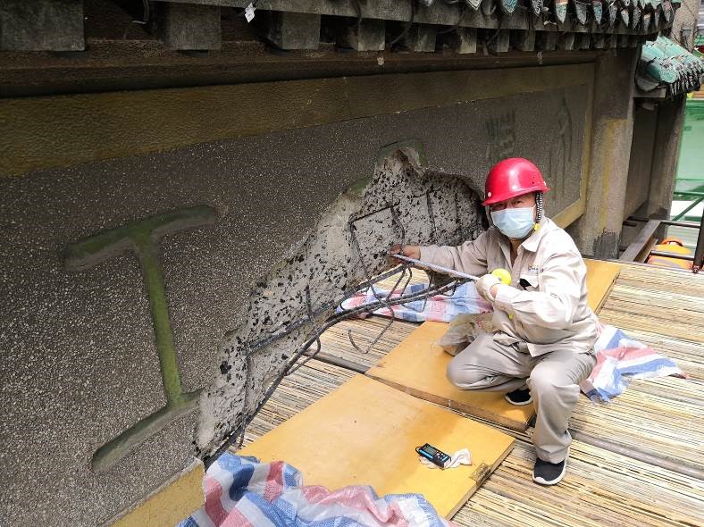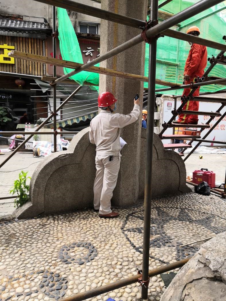 6月12日上午8點,在老牌坊搶險加固項目的施工平臺搭建完成后的第一時間,巨成公司現(xiàn)場值守檢測人員立即對老牌坊的損傷情況進行了詳細的勘查檢測工作。包括老牌坊的建筑結構圖紙測繪復原,損傷區(qū)域的位置、尺寸、影響范圍及嚴重程度的測量評估,結構基體材料強度檢測,表面裝飾層做法調(diào)查,結構整體變形測量等多方面的內(nèi)容。此次檢測工作嚴格遵守文物保護工程的管理要求,尊重老牌坊作為歷史文物的價值,以減少對結構本體的干預為基本原則,各項參數(shù)均采用了無損檢測的作業(yè)方法,并取得了良好的效果。