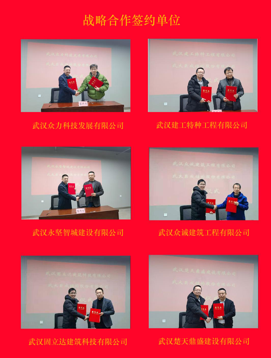 2020年12月24日,公司在巨成大廈四樓再次舉行湖北加固改造企業(yè)戰(zhàn)略合作協(xié)議簽訂儀式,本次簽約單位有武漢眾力科技發(fā)展有限公司、武漢建工特種工程有限公司、武漢眾誠建筑工程有限公司、武漢永堅智城建設(shè)有限公司、武漢楚天鼎盛建設(shè)有限公司、武漢固立達建筑科技有限公司。公司總經(jīng)理萬雄衛(wèi)、副總經(jīng)理廖杰洪、副總經(jīng)理張暢、營銷公司相關(guān)負責(zé)人參加了本次簽約儀式。