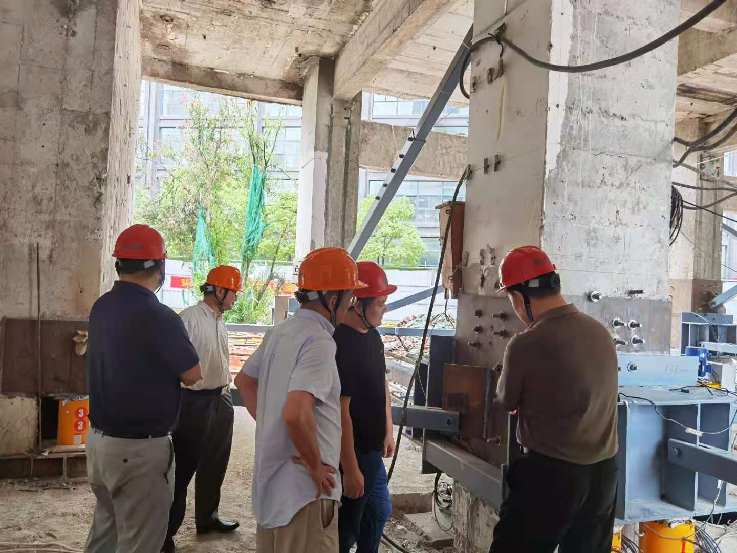 7月2日下午,在董事長高作平教授的帶領(lǐng)下,公司董事、監(jiān)事、專家、經(jīng)理層等30余人來到武漢市科技館項目部觀摩指導(dǎo)現(xiàn)場頂升糾偏施工預(yù)頂試驗。