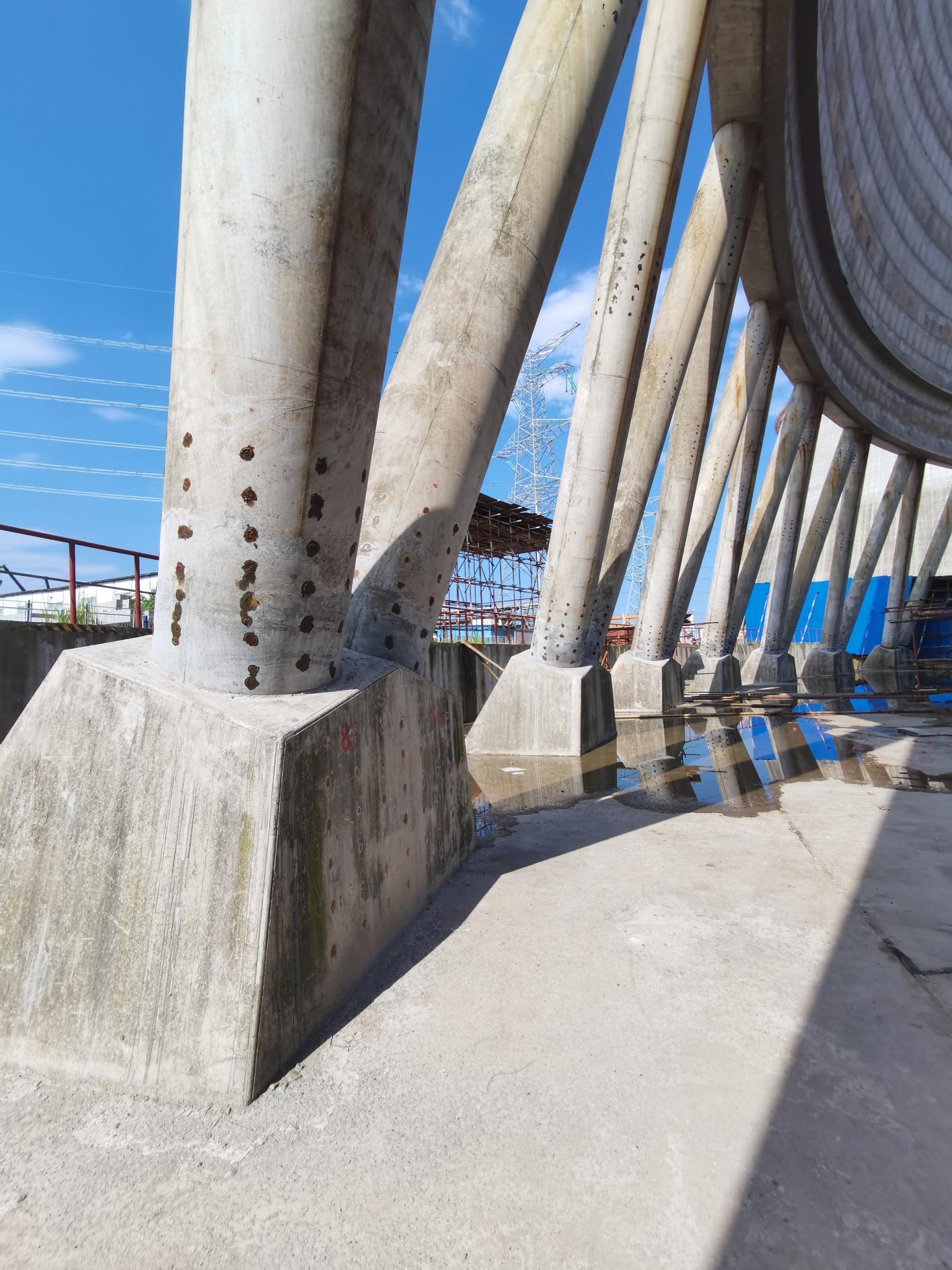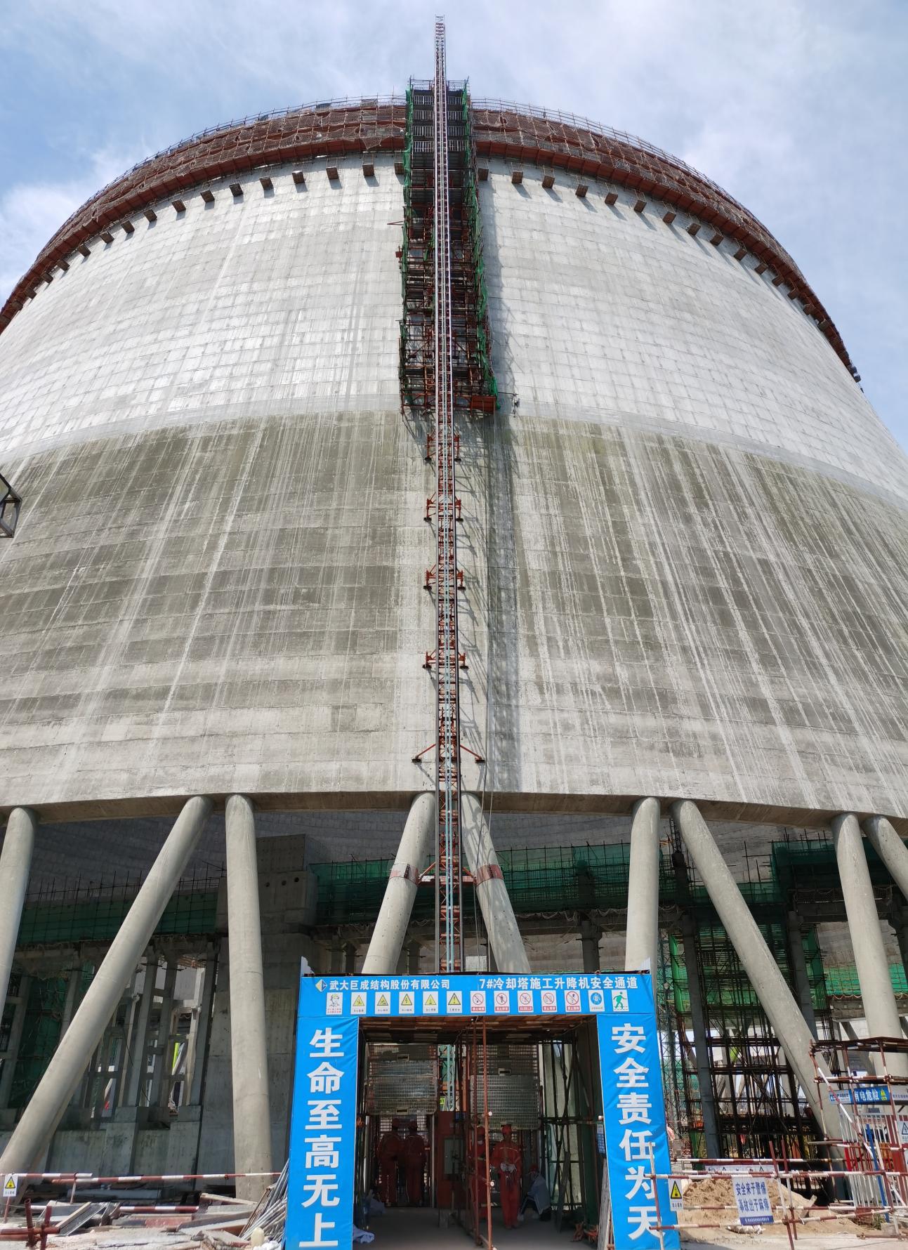 豐城電廠7#冷卻塔因發(fā)生過特大安全生產(chǎn)事故,為各方所關(guān)注。2020年復(fù)工后,巨成結(jié)構(gòu)憑借過硬的技術(shù)實力,榮譽(yù)承接了冷卻塔筒壁設(shè)計與加固工程。該工程屬于高危項目,開工前,巨成結(jié)構(gòu)的設(shè)計方案和施工組織設(shè)計均通過了專家論證。其中采用的多項巨成專有技術(shù)也得到了各位專家的認(rèn)可,如:擴(kuò)孔自鎖錨固技術(shù)保證新舊混凝土緊密結(jié)合、補(bǔ)償收縮細(xì)石混凝土保證施工質(zhì)量、便攜式鋼平臺保證施工安全、曲線施工升降機(jī)保證垂直運輸。