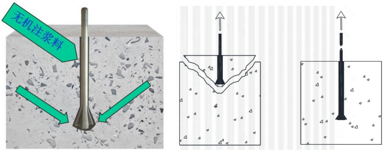 擴孔自鎖錨桿只有兩種破壞形式,不會發(fā)生化學植筋中的滑移破壞。自鎖錨桿的優(yōu)點是:底部擴大形成機械咬合提供錨固力,錨固深度更淺;灌注無機注漿料,不懼溫度和濕度的影響,耐久性與被錨固體一致,克服了化學植筋不耐高溫、不耐潮濕以及耐久性差的問題。