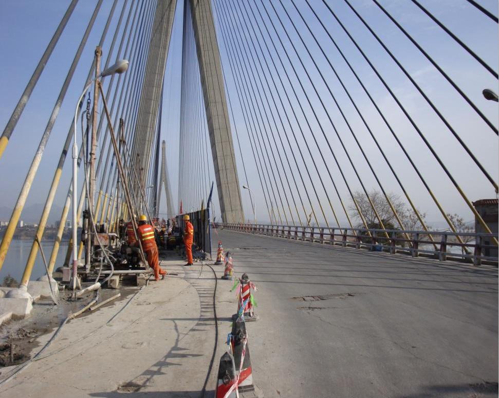 鄖陽漢江公路大橋位于湖北?堰市,是209國道上的重要橋梁,1989年11月動工,1994年2月通車。后發(fā)現(xiàn)箱型墩側(cè)壁出現(xiàn)側(cè)向裂縫,原因分析可能是預(yù)應(yīng)力失效所致。應(yīng)用武大巨成公司預(yù)應(yīng)力自鎖錨桿對橋臺進行加固,單根自鎖錨桿預(yù)應(yīng)力為561kN。