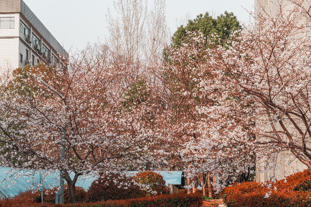 “珞珈山水,巨成之源”,巨成在大樓旁廣種櫻花樹,陽(yáng)春三月,櫻花盛開,生機(jī)勃勃,鳥語(yǔ)花香!