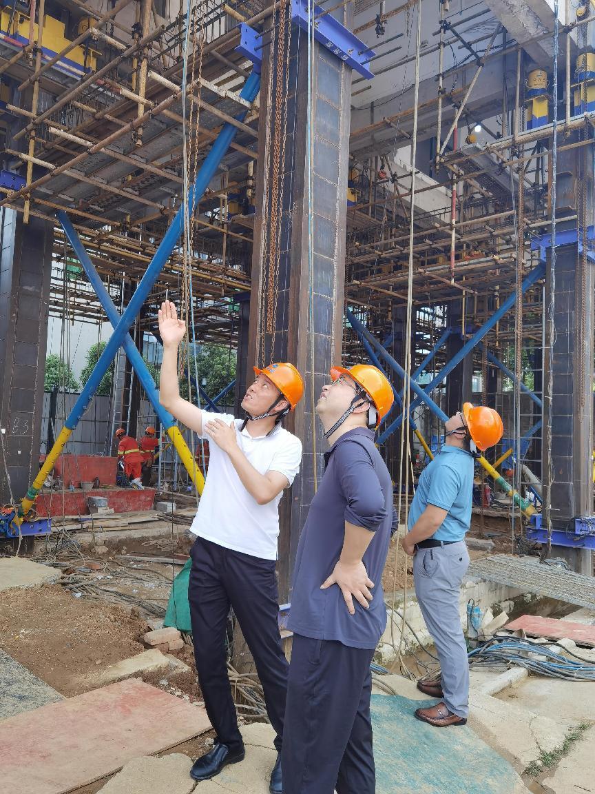在巨成群控同步頂升工程試驗(yàn)項(xiàng)目現(xiàn)場(chǎng),葛總一行仔細(xì)了解了頂升試驗(yàn)的過(guò)程。院長(zhǎng)助理周志勇詳細(xì)介紹了鋼滑道頂升技術(shù)的原理和應(yīng)用。雙方在現(xiàn)場(chǎng)對(duì)技術(shù)細(xì)節(jié)進(jìn)行了深入交流并查看了相關(guān)數(shù)控設(shè)備,葛總對(duì)巨成在研發(fā)上所做的努力和創(chuàng)新表示了極大的認(rèn)可。